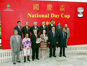 二○○二國慶盃由正蝦王勝出。中央人民政府駐香港特別行政區聯絡辦公室主任高祀仁先生(前排右二)頒發獎盃及銀碟予正蝦王馬主劉錫康伉儷(前排右三及右四)。 |