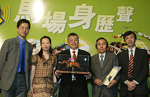 香港賽馬會於國慶賽馬日推出富有濃厚藝術色彩的「藝術家系列」賽馬精品。馬會市場策劃及發展經理莫毅信先生致送限量版「靚蝦王」雕塑予「靚蝦王」馬主劉錫康伉儷(左二、左三)及印有「電子麒麟」油畫的真絲領帶予「電子麒麟」馬主盧榮民先生(右二),以感謝他們對製作是系列精品的支持。「藝術家系列」賽馬精品以自學成名的藝術家盧啟源先生(右一)的藝術作品為藍本。 |