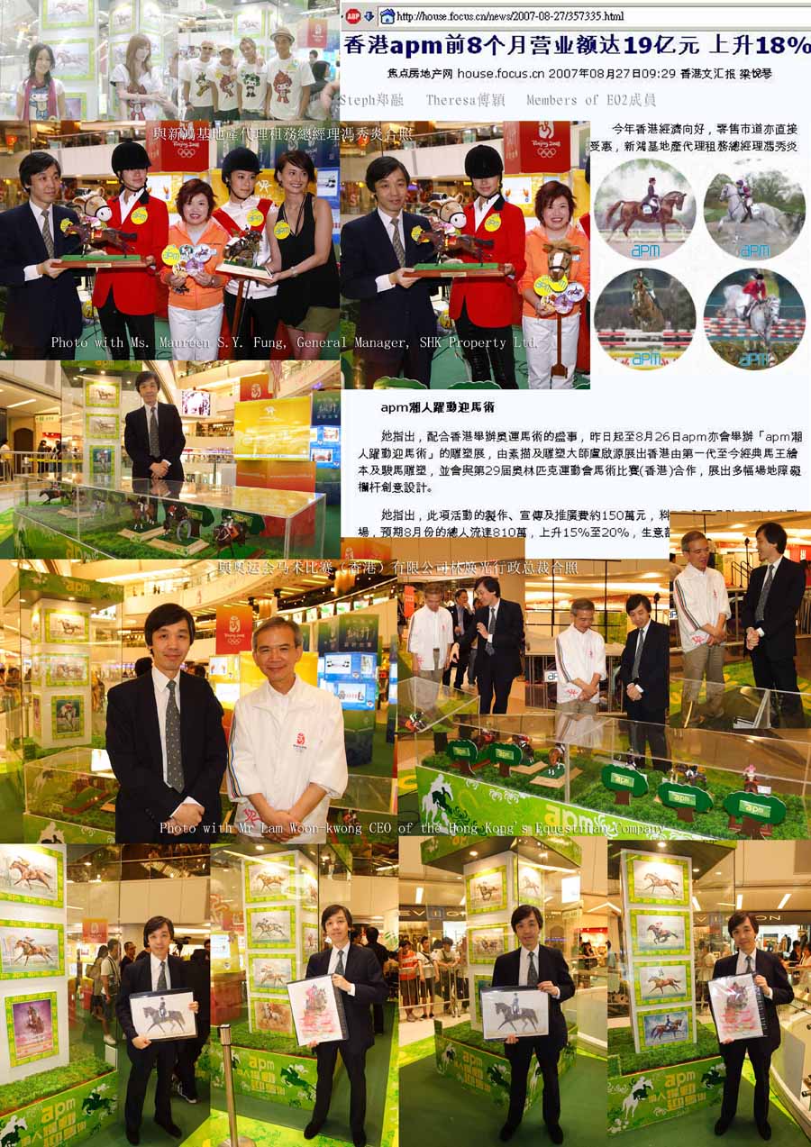「潮人躍動迎馬術」盧啟源繪本及雕塑展 20070820-27 Circle LO Equestrian Paintings and Sculptures APM Exhibition サイクル ロー氏の絵本及び彫刻品の展示会 Steph郑融 Theresa傅穎 Members of EO2成員 女優鄭融,傅頴,E02のメンバー. 與新鴻基地產代理租務總經理馮秀炎合照 Photo with Ms. Maureen S.Y. Fung, General Manager, SHK Property Ltd. SHK不動産グループ賃貸部總経理と写真を撮りました 與奥运会马术比赛(香港)有限公司林焕光行政总裁合照 Photo with Mr Lam Woon-kwong CEO of the Hong Kong's Equestrian Company オリンピック馬術レース香港有限公司取締り林煥光氏と写真を撮ります. 盧啟源雕塑示範 Circle LO sculpturing demonstration サイクル ロー氏の彫刻作品実物宣伝会 與Rosemary,陳苑淇, 韓君婷 合照 Photo with Vandenbroucke, Jolie Chan. Belinda Han 女優達と写真を写ります 特別鳴謝何君明 呂鈞揮 盧俊傑 霍錦波與程明暉慨允發表其攝影傑作及翻譯給大家欣賞。並謹此對所有相關內容之友情連接和轉載來源媒體深表謝意。 |